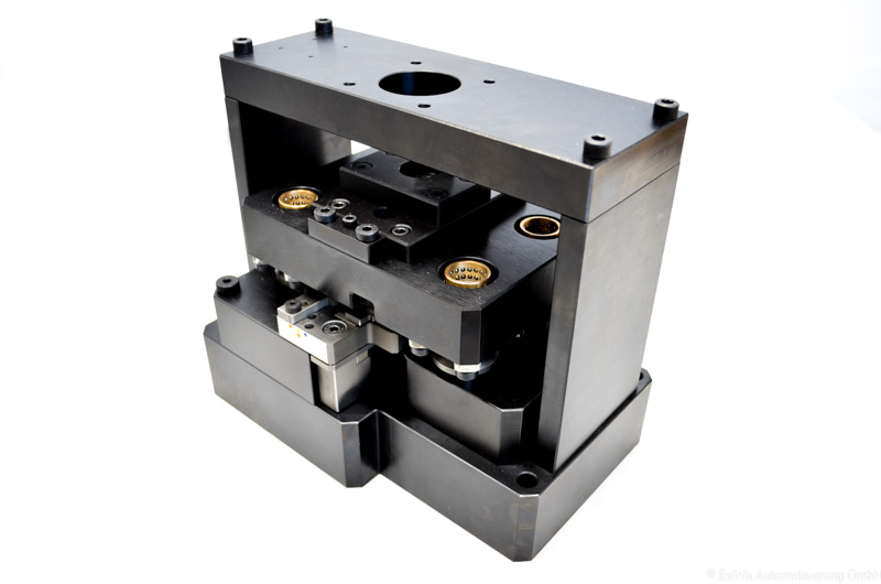 Bei der Integration von Montageprozessen ist eine Zuführung von kleinen Produkten auf Endlosbändern erforderlich. Zu Vereinzelung dieser Produkte kommen individuelle Stanzwerkzeuge zum Einsatz. Hierbei wir das jeweilige Produkt vom Trägermaterial entfernt und dem Montageprozess zugeführt. Dieser Prozess ist bei der Bestückung von Kunststoffstecker mit sogenannten Terminals essenziell wichtig. Bei allen Stanzprozessen spielt ein gratfreies sowie flitterfreies Stanzen eine große Rolle.